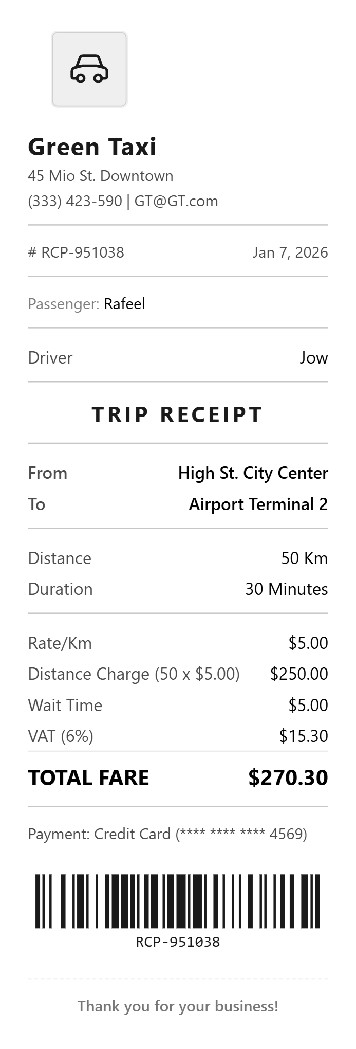 A: Absolutely! All receipts are designed to be printer-friendly. Download your receipt as a PDF and print it on standard paper or thermal receipt paper. The format is optimized for clear, professional printing.