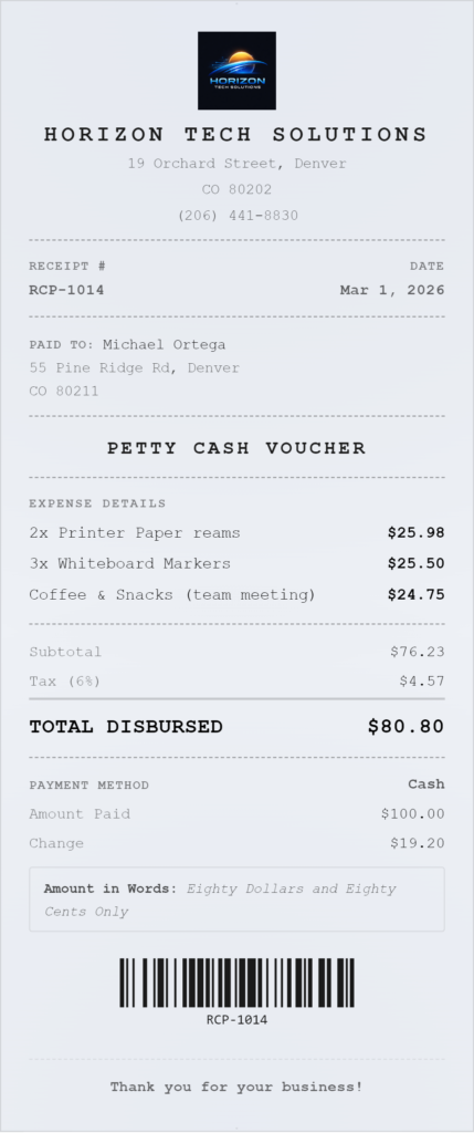 A petty cash receipt documents small expenses drawn from a company’s petty cash fund. Unlike standard payment records, these require manager approval, expense categorization, and should be attached to the original purchase receipt when possible. They help businesses track minor expenditures that would be impractical to run through normal purchasing processes.