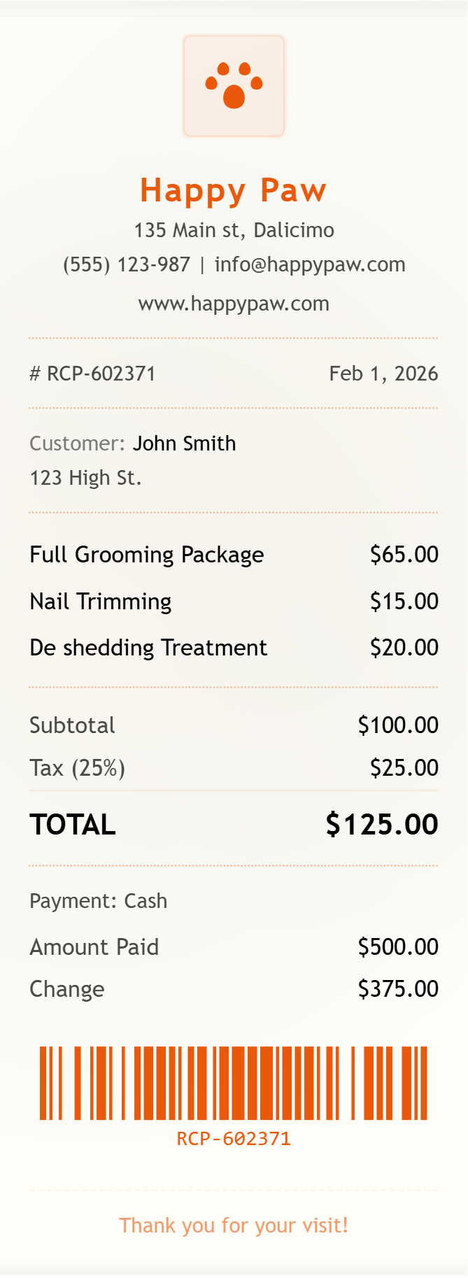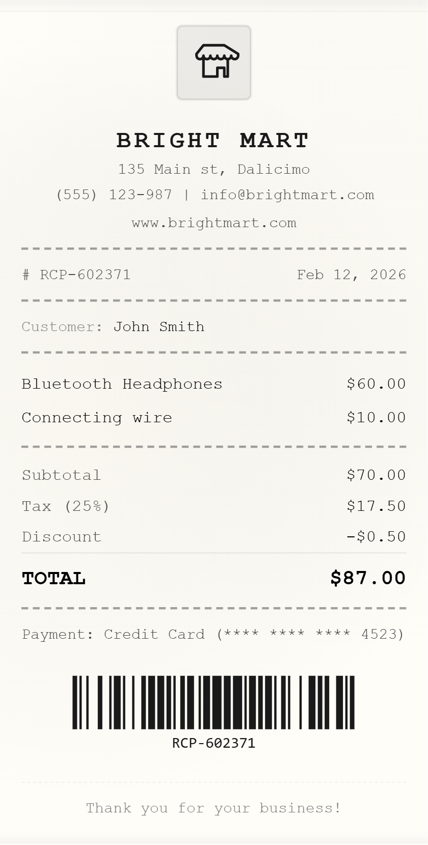 Our retail receipt templates include designs for popular stores and generic retail formats. Perfect for creating business receipts for product sales.