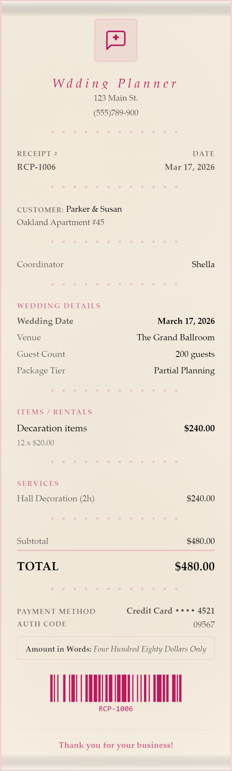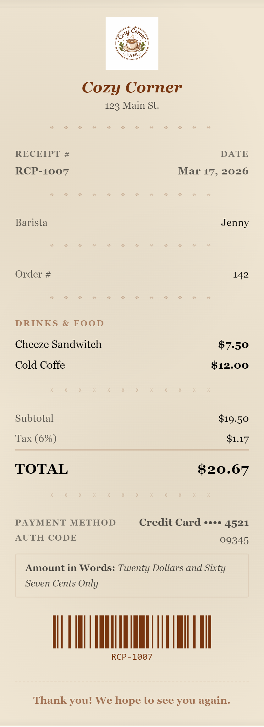 Generate professional receipts instantly with our extensive library of free receipt templates. Whether you need a restaurant receipt, taxi receipt, hotel receipt, or business receipt, we have templates tailored for every industry and use case.