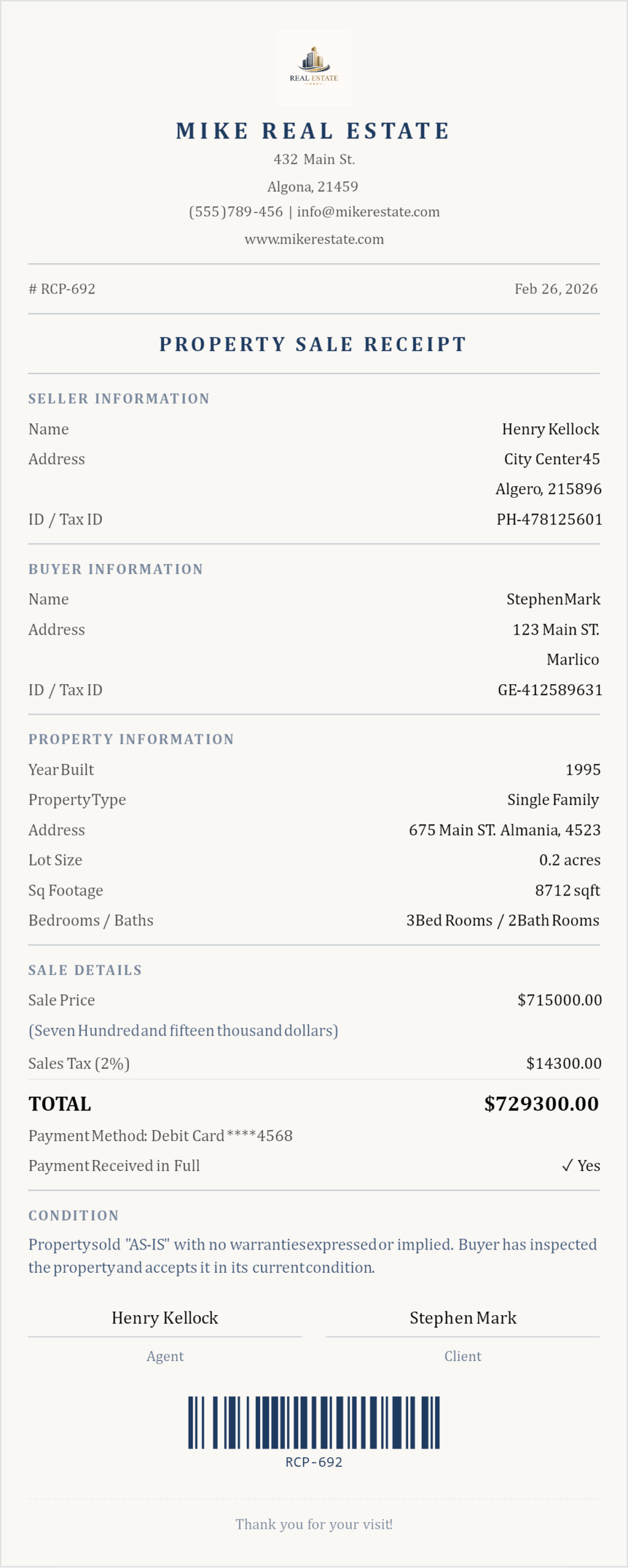 A:You can create a resale market receipt using our resale market template. This template includes authentication details, condition of item, tracking number and verification number.