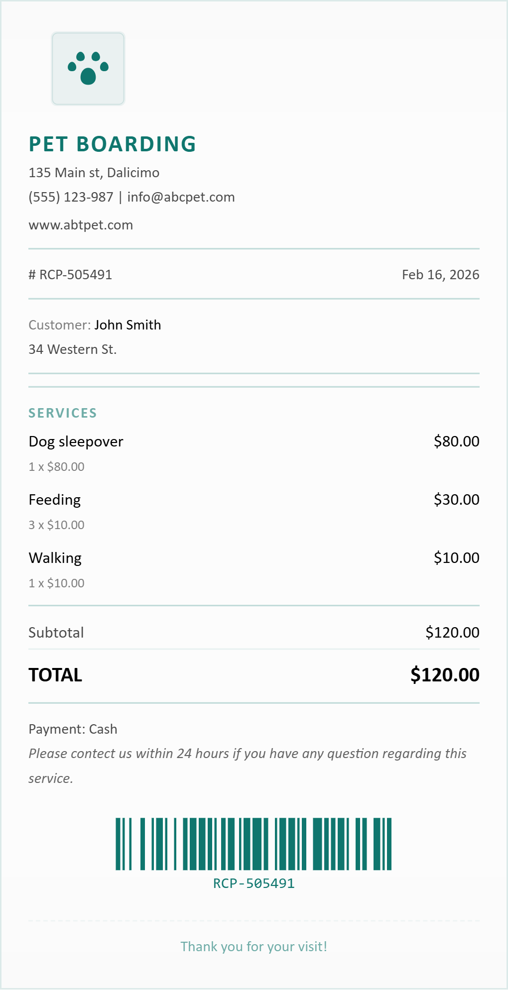 Step 3: Generate & Download Download your customized receipt as PDF or PNG. All our templates free to use with no watermarks.